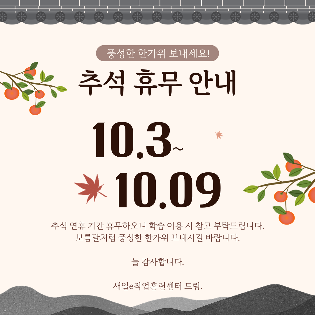 10월 3일(금) ~ 10월 9일(목)까지 추석 연휴로 운영하지 않습니다.